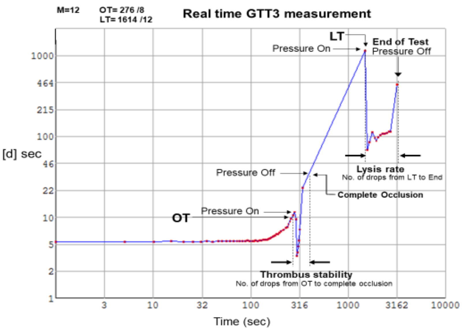 In the GTT-3, while blood flows under gravity, constant external pressure is applied to the blood for two set time periods. The first period of applied pressure occurs from the beginning of thrombus formation until complete occlusion. The second period of applied pressure occurs after detecting the onset of spontaneous thrombolysis until the end of test. Pressure-driven flow allows the assessment of the dynamic process of thrombus growth, stability and the rate of spontaneous thrombolysis.