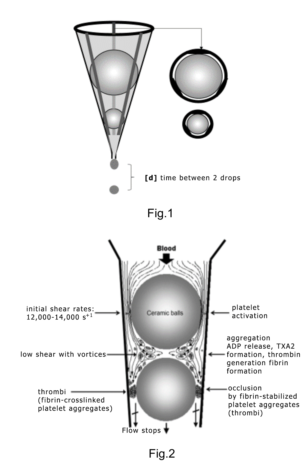 When blood is added to the tube, it flows through the narrow gaps by the ball bearings and the droplets are collected in a reservoir downstream. Passing through the gaps by the upper (larger) ball bearing, platelets are exposed to high shear stress and become activated.